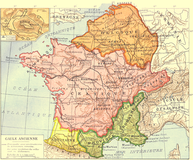 Carte de la Gaule en 54 av. J.-C. « Novempopulania » en jaune sur cette carte était connue premièrement sous le nom d’« Aquitania ». Les Celtes en rose, le Belges en orange, la Gaule narbonnaise en vert et les ancêtres des Basques, les Aquitains en jaune..