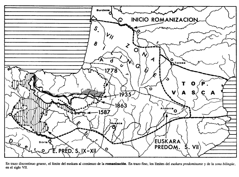 Le tracé gras: limite de l’euskara au début de la Romanisation En tracé fin : limite de l’euskara et la zone bilingue au VIIe siècle. © 2002-2009 Eusko Ikaskuntzaren Euskomedia Fundazioa