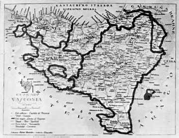 EuskaldunComme nous l’avons vu, le mot « eusko » et ses variantes « ausko », « vasco », « ouasco », s’écrivent depuis l’époque romaine et sont la première référence écrite sur peuple basque. Toutefois les mots avec le suffixe « -dun » n’apparaissent que plusieurs siècles plus tard. Jusqu’à présent, la première apparition de ce suffixe se trouve dans un document de Eslaba (Haute-Navarre, proche de Zangoza (Sangüesa)) qui date de 1276 et où apparaissent les mots « erdaldun » et « erdara »[79] (celui qui ne sait pas ou qui ne possède pas l’euskara) , antithétiques ou qui est contradictoire à « euskaldun » (celui qui sait ou qui possède l’euskara) et « euskara ». À Sangüesa en 1366, deux gentilhommes portent le surnom d’« Erdara » et peu avant à Artaxona (Artajona proche de Taffala), il y a le nom de « García Erdalduna », ce qui démontre que l’ignorance du basque ou de la langue navarraise était plutôt inhabituelle dans la zone moyenne de la Haute-Navarre. Mais les changements de noms des Basques et de notre territoire, en fonction des conquêtes et des impérialistes qui continuent à fractionner politiquement notre « Amalur » (Mère-nature ou Mère-patrie) au dépend de nos propres intérêts, ne s’arrêtent pas ici.