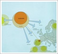 Un euskara millénaire : Tous les historiens s’accordent pour admettre que l’euskara était la langue propre à la gens vasconica de l’Antiquité, qui occupa grosso modo le territoire de l’actuelle Navarre (sans écarter la possibilité que d’autres langues aient pu exister à certains moments dans des zones précises). La continuité de ce basque originel s’est reflétée fidèlement dans les Vascons du Moyen-Age, les "Navarrais" du royaume indépendant et les habitants de la Navarre des Temps Modernes. Ce n’est qu’à l’époque contemporaine que le basque navarrais a cédé du terrain à une vitesse vertigineuse. La carte ci-jointe illustre graphiquement cette évolution géolinguistique (carte originale établie à partir de sources diverses). |
